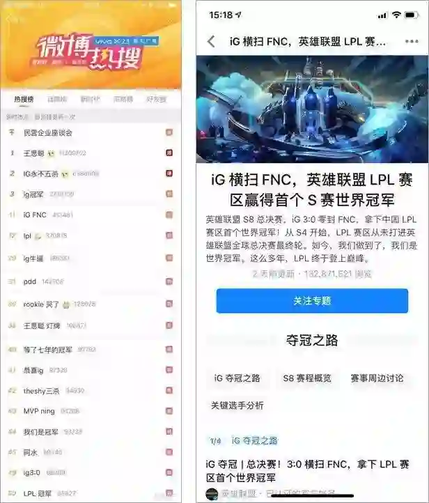 比赛结束后,IG 夺冠的相关话题瞬间占领了微博的热搜榜,最高的 # 王思聪 # 搜索量达 1000w+,配上鲜红的“爆”字,围观群众都感受到了火热。