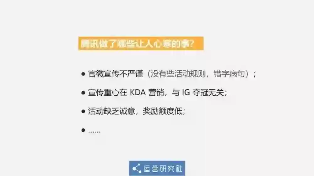 总之,让 KDA 皮肤营销时紧扣 IG 夺冠的主题,调动起用户对夺冠这件事的荣誉感,成全老玩家对游戏的情怀。如同王思聪的那条抽奖微博,将大众的视线转回夺冠,既成功关注事件本身,更成全大家的情绪发泄,自然能实现引爆的效果。
