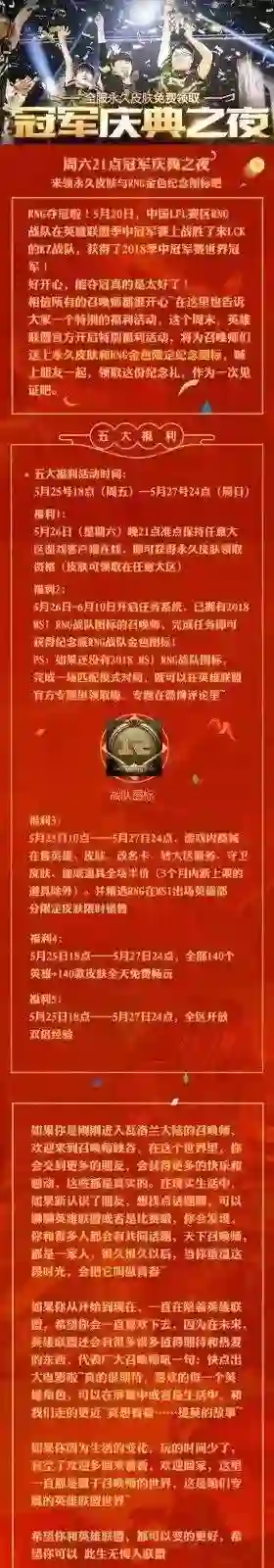 今年 5 月,RNG 夺得了 MSI (季中冠军邀请赛)的冠军,夺冠时千万粉丝同庆。那次官方很有作为,几个小时就推出了活动,又送永久皮肤,又送 RNG 金色限定纪念图标,还有什么商城全场半价,一共推出了五大福利。