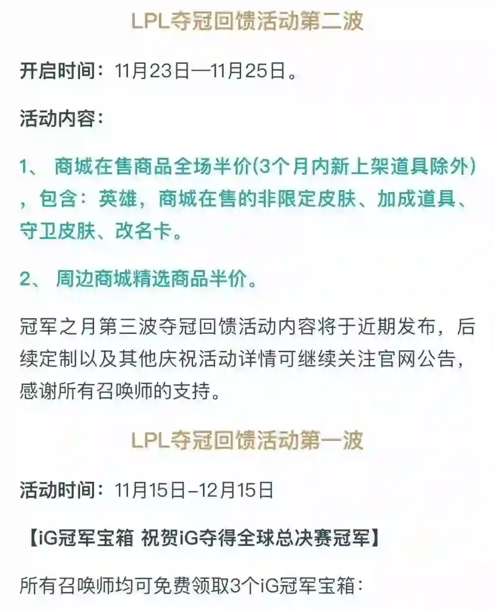 而如今,IG 11 月 3 日夺冠,官方直到 11 月 5 日才放出活动预告(后迫于压力改为第一波活动),但仅仅是永久皮肤一个,随机图标一个(excuse me??冠军限定的图标都不能给一个吗?),再加上战队此次总决赛使用的英雄及皮肤的30天使用权,没了。