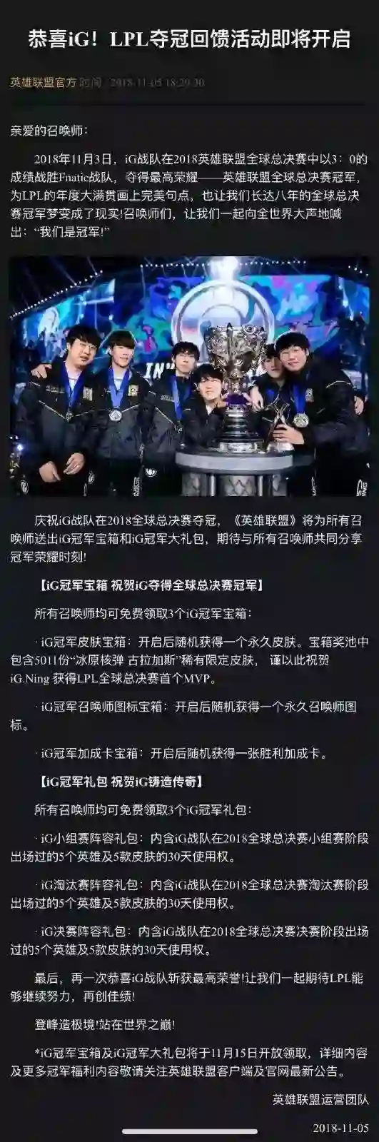 IG 夺冠,玩家缺的不是国服发给他们的福利奖励,他们只是希望一支承载着他们冠军梦的战队,能得到冠军该有的殊荣。