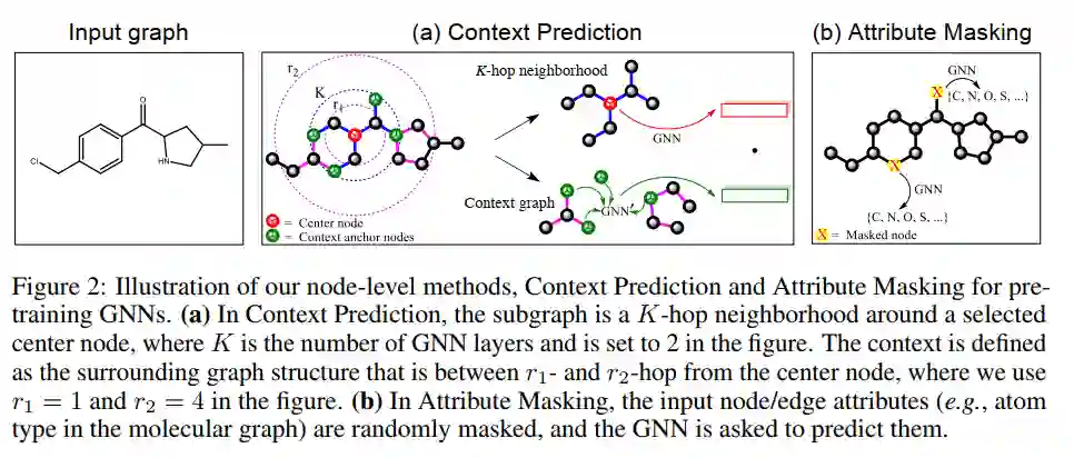 在节点级上,预训练时分别考虑图的结构特征以及属性特征。在结构特征方面,文中将常见的“节点-邻居”模型扩展为“节点邻居子图+上下文子图”,用节点邻居子图与上下文子图的相似性衡量结构相似性,分别用图神经网络学习两个子图的特征。节点邻居子图和上下文子图之间的锚节点(“context anchor nodes”)体现了节点邻居子图和上下文子图之间的信息关联。在属性特征方面,利用”MASK-PREDICT”的方法,通过分别mask节点和边的属性来学习图的属性特征,这种方法可以是的帮助模型对 domain knowledge 的学习。