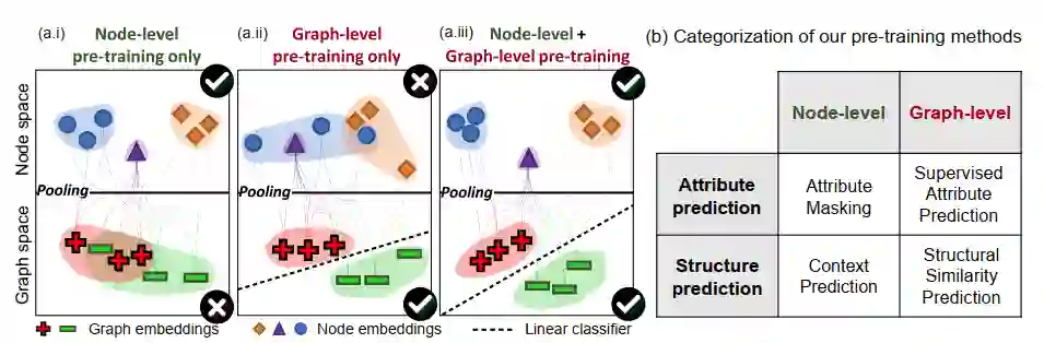 预训练是通过大量无标注的数据进行模型的训练,得到一套模型参数,利用这套参数对模型进行初始化,再根据具体任务在现有语言模型的基础上进行精调(MSRA)。预训练的方法在自然语言处理与计算机视觉领域,都被证明拥有更好的效果。不过,在图的表示学习领域,预训练仍然是一个具有挑战性的问题。本文提出了一个在多图分类任务上的图神经网络预训练模型,希望得到节点级别和图级别的高质量预训练参数,可以鲁棒的迁移到下游任务。