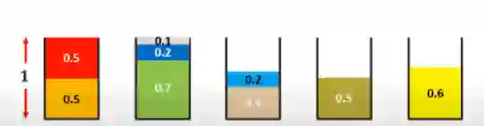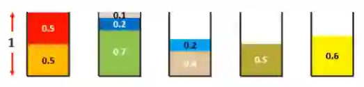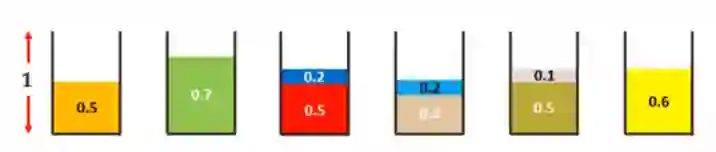 我们来看一个示例:项是 0.5, 0.7, 0.5, 0.2, 0.4, 0.2, 0.5, 0.1, 0.6,箱子大小均为 1。