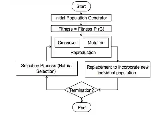 遗传算法(genetic algorithms, GAs)是一种自适应的启发式搜索算法, 它模仿达尔文进化论中的“适者生存”的原则, 最终获取优化目标的最优解。下图描述了一个简单的遗传算法流程: