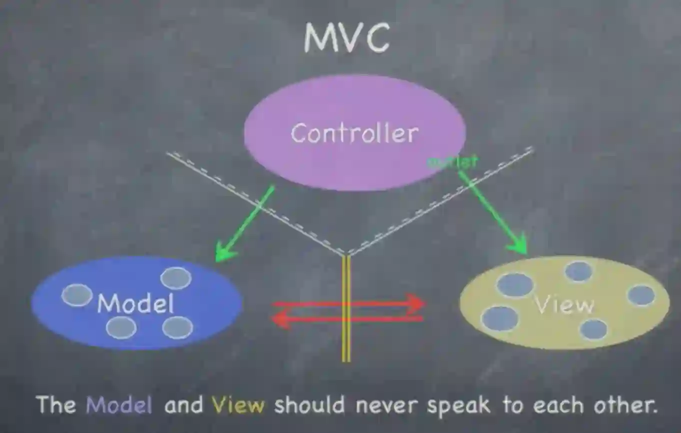 在上图中展现了MVC中各个模块之间的通信方式,其中,Controller可以无限制的与Model和View通信,Controller需要从Model层拿到数据,并告诉View层如何显示这些数据。图中红色的箭头表明,Model与View之间是绝对不能相互通信的 ,这样做是为了降低模块间的耦合度,方便修改和维护。另外,图中的双黄线,也表明Model是绝对不能跨过黄线与View有关系的。其中有点难以理解的是Model和Controller以及View和Controller之间的线是实现与虚线混合,虚线表示Controller可以跨过。