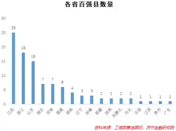 在100个中国县域经济的代表中,江苏、浙江、山东这三个省份可以用“霸榜”来形容,三个省份的百强县数量分别为25、18、15个,占据百强县多数席位,而多数中西部、东北地区的省份无缘县域百强。