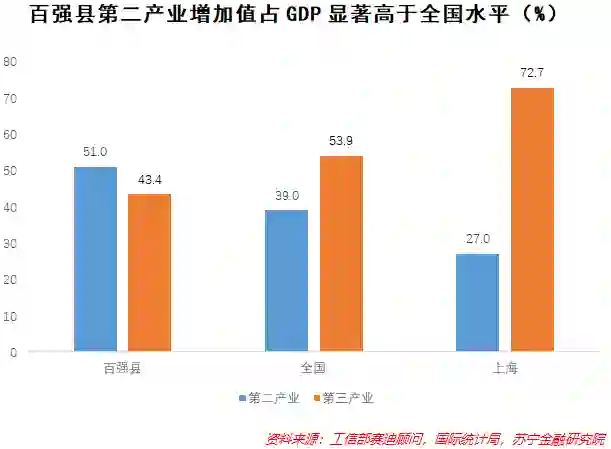 从百强县的发展情况看,绝大多数百强县的发展依然依靠工业和投资,根据赛迪顾问的数据,百强县规上工业增加值和第二产业增加值及增速都远超广东、江苏、山东和浙江等发达省份。