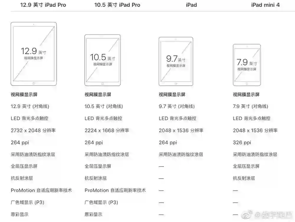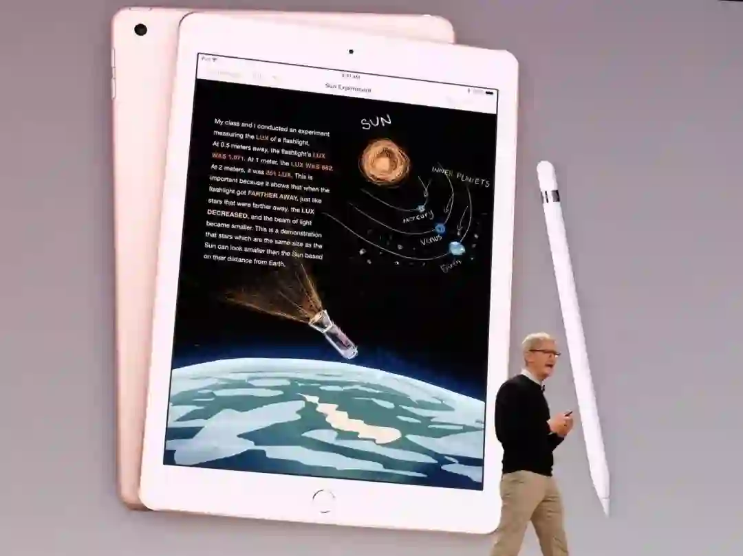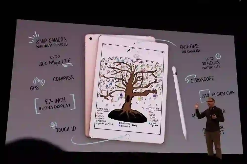 尺寸(和边框)看起来与当前的iPad完全相同。支持Apple Pencil,重量约453克,内置A10处理器,续航时间达 10 小时,支持 Touch ID、Rkit,支持 300MBps LTE 网络。