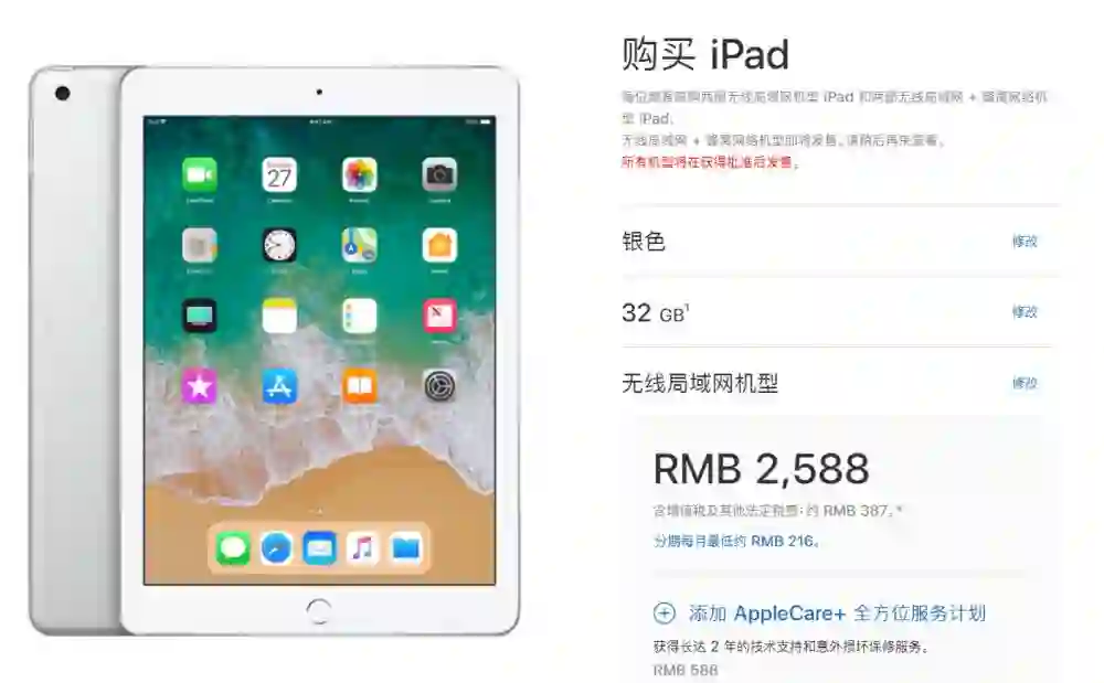 32GB Wi-Fi 版 2588 元,32GB Wi-Fi+4G 版 3588 元。如果是学校购买,起售价为 2388 元。Apple Pencil 单独购买 748 元,学校购买 668 元。