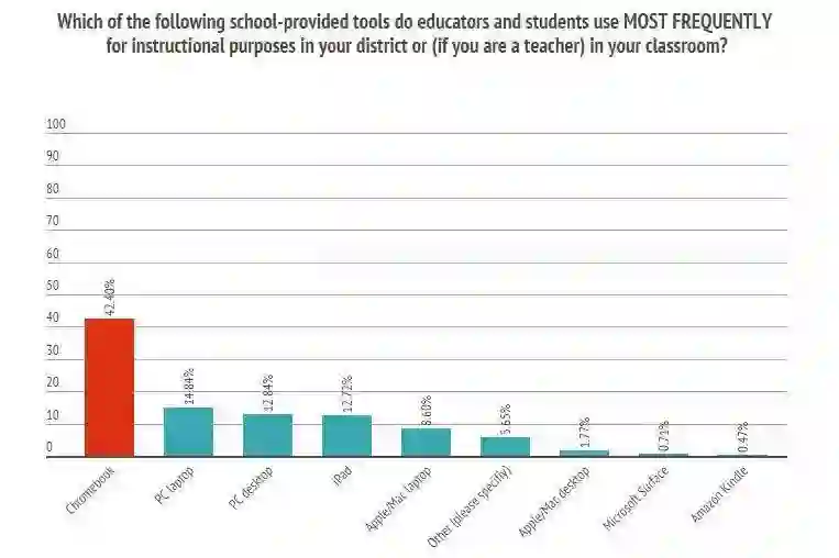 在美国 K-12 教育市场,最近几年的领头羊都是 Chrome OS,得益于操作简单,价格低廉(不到200美元)的特点,ChromeBook 拦下了教育市场过半的份额,在满意度和软件使用率上也遥遥领先。