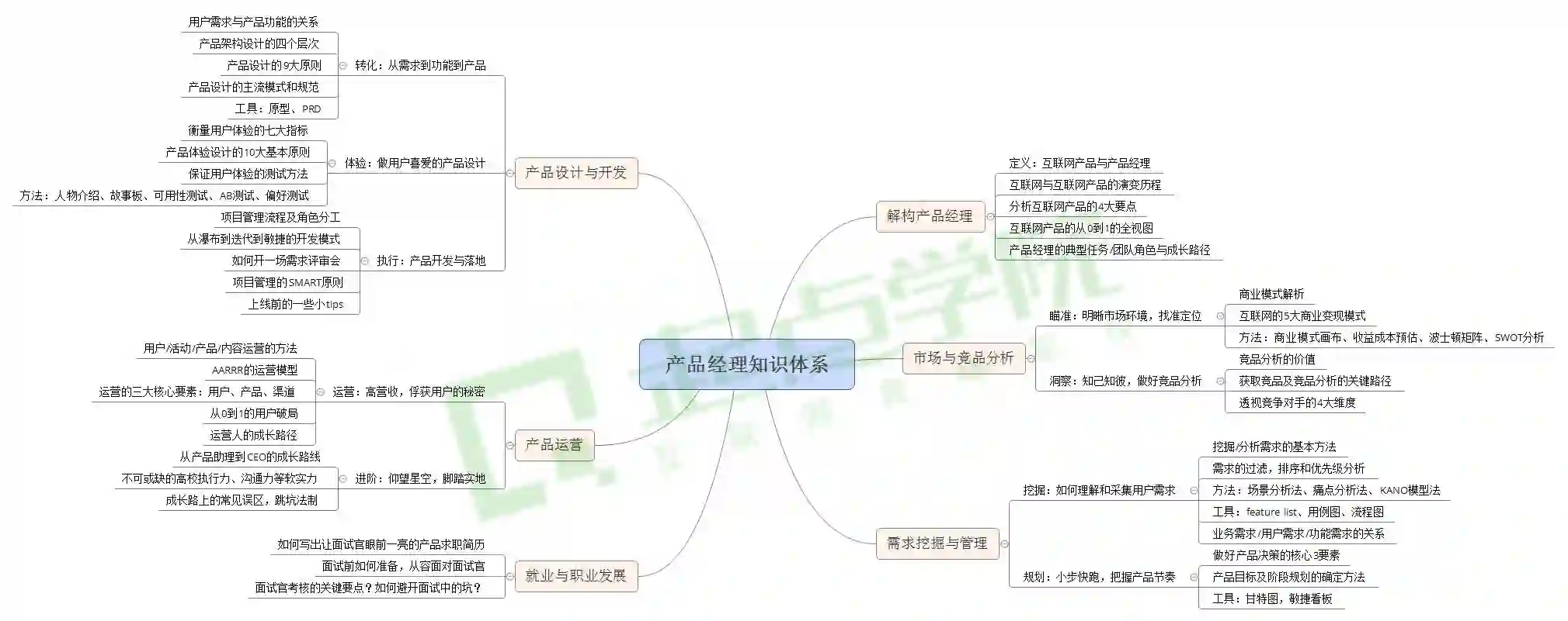 ● 体系化知识框架:这里总结了关于产品经理基本技能知识成长体系,供大家体系化的学习参考,这里不多说,戳大图一项一项的匹配学习,一步一个脚印,踏实地把坑补完。