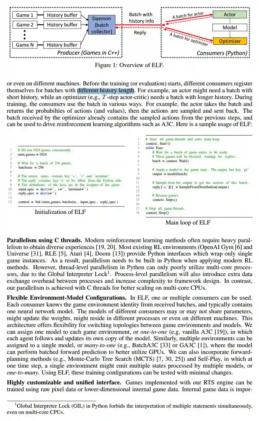 Lightweight: ELF runs very fast with minimal overhead. ELF with a simple game (MiniRTS) built on RTS engine runs 40K frame per second per core on a MacBook Pro. Training a model from scratch to play MiniRTS takes a day on 6 CPU + 1 GPU.