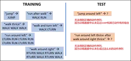 表面上看,这是个非常简单的序列到序列生成任务。在收集到大量自然语言句子以及它们所对应的指令序列之后,随机划分成训练集和测试集,用现有的深度学习模型进行训练,即可在测试集上达到99.8%的准确率。然而,一旦从组合性的角度对训练集和测试集的划分方式加以约束,深度学习模型就不再有效。