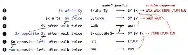 例如,在第1步中,将单词“run”映射到了程序“RUN”上;在第3步中,将抽象子句“$x opposite $y”映射到了程序“$Y $Y $X”。此处的“$X”是一个程序中的变量,指代自然语言中的变量“$x”所对应的程序;同样地,$Y$亦是一个程序中的变量,指代自然语言中的变量“$y”所对应的程序。