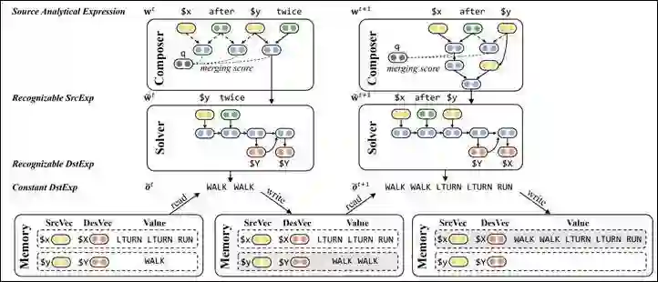 图7解释了 LANE 的工作流程,也展示了 LANE 如何处理图6中的第5步和第6步抽象。在第5步抽象化过程中,对于当前的 SrcAE “$x after $y twice”,Composer 基于树状 LSTM 输出下一步抽象动作:应该对“$y twice”这个局部进行抽象化。Solver 则使用一个深度编解码网络将“$y twice”解释为 DstAE “$Y $Y”,与原 Memory 中的“$Y = WALK”结合得到新变量所对应的 DstExp “WALK WALK”,并以此更新 Memory。