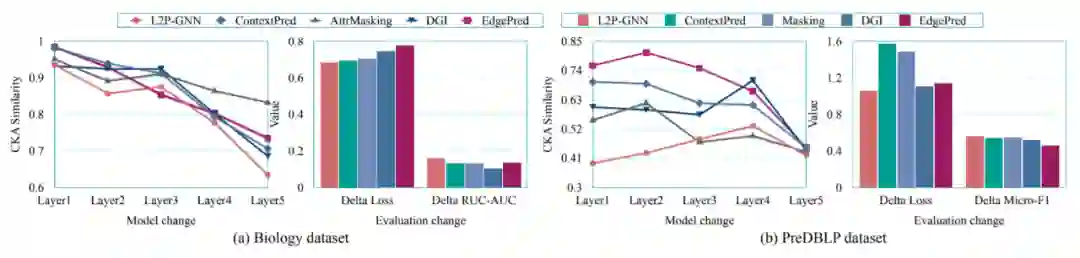 如图 2 所示,微调前后 L2P-GNN 参数的 CKA 相似性通常小于基线,这表明 L2P-GNN 经历了更大的变化,从而更加适应下游任务。