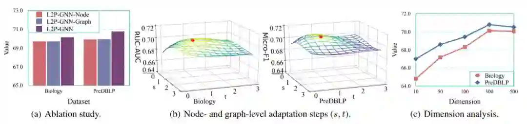 该论文研究了节点、图级适应步幅数 (s, t) 和节点表示维度的影响。图 3(b) 绘制了 L2P-GNN 在 0 ≤ s ≤ 3 和 0 ≤ t ≤ 3 下的性能。