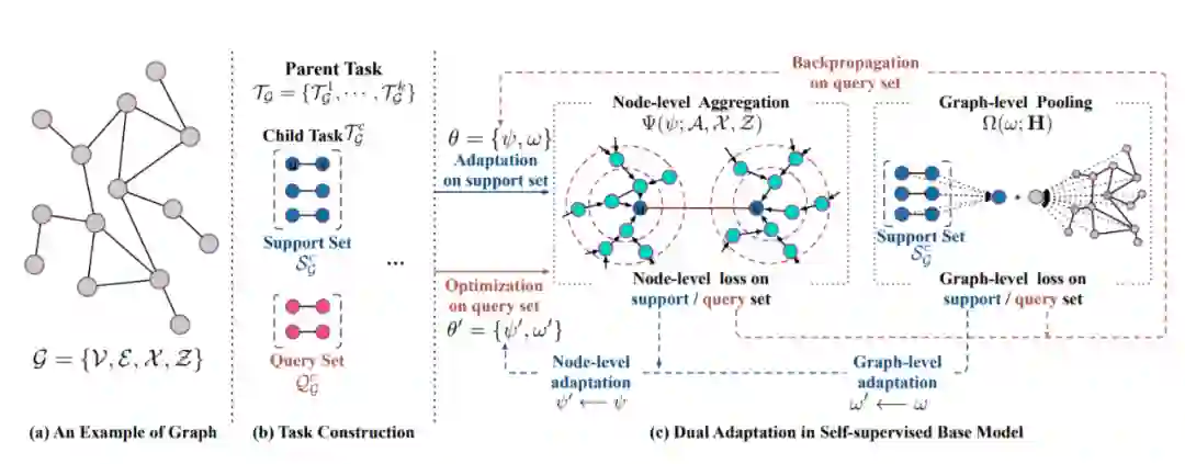 该研究首先提出了一个自监督 GNN 模型,在模型无关元学习(MAML)设置中学习图结构,然后是节点和图级双重适应,以模拟预训练过程中的微调。
