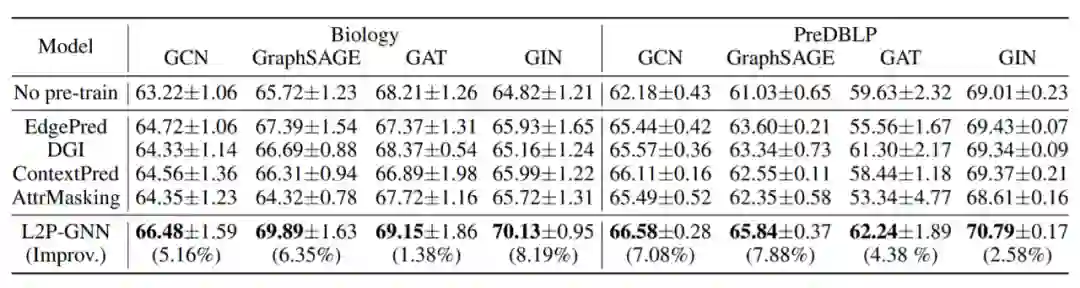 表 2 对比了 L2P-GNN 和 SOTA 预训练基线(4 种不同的 GNN 架构)的性能,得到了以下发现: