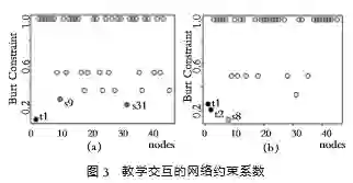 因此,在调动学生学习积极性上,教师群体需要反思如何在新环境中实现有效交互。在图3(b)中,学生s8有相对较低的网络约束系数,表明在网联课程的班级中,个别学生对该门知识感兴趣,当课堂交流不充分时,自然产生了分担教师角色的中间人。