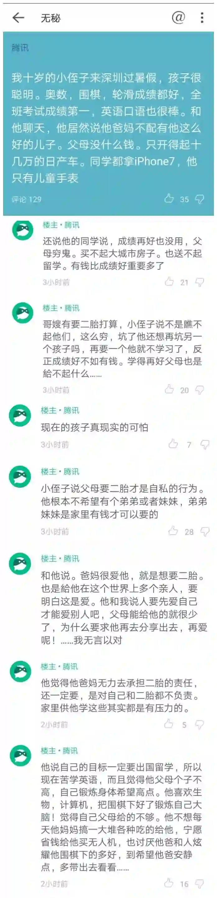 关于这种孩子,如果你问网友对此的看法,大部分人都会说:孩子看的很透彻,只不过说话太直白而已。但如果你再问:你愿意自己的孩子成为这样吗?绝大多数人都坚决摇头。