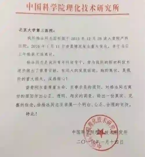 不仅如此,杨冰丈夫还搬来了老婆生前的单位—中科院理化所,出具了一份霸气十足的红头公函。由于中科院这种级别单位的卷入,以及北医三院正面硬刚毫不妥协的态度,使事件不断升级,被部分媒体冠以“顶级医闹”。