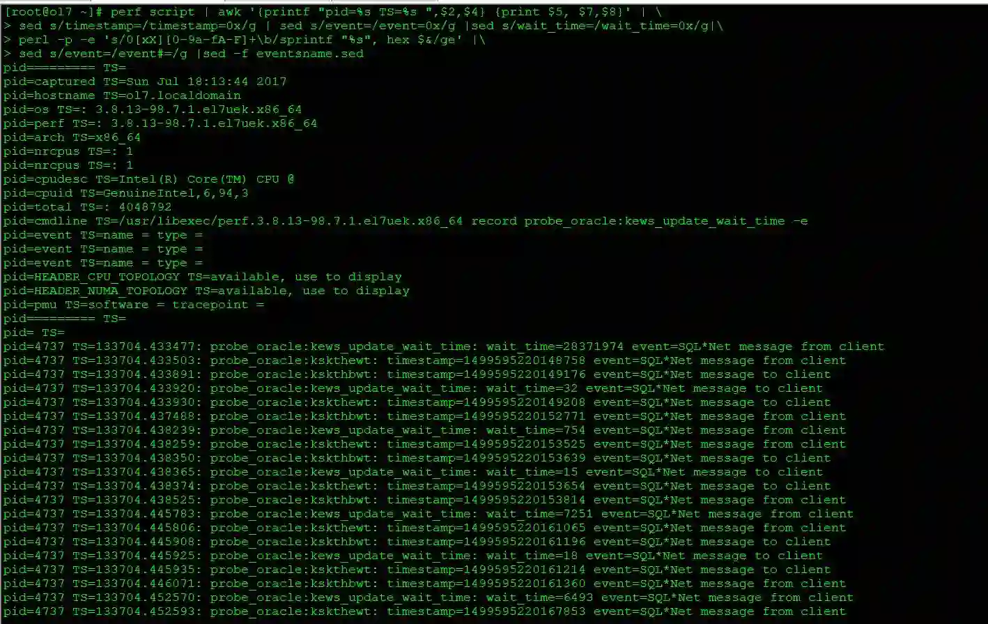 上图我们能够看到探针做的一些事情。会话2794等待事件0x162,等待时间ox553df61f78f21,然后下一个等待事件0x93,等待时间0x553df61f7938d。这些数据不是很直观,我们需要对其格式化一下。等待事件的这些编号需要从视图v$event_name获取。