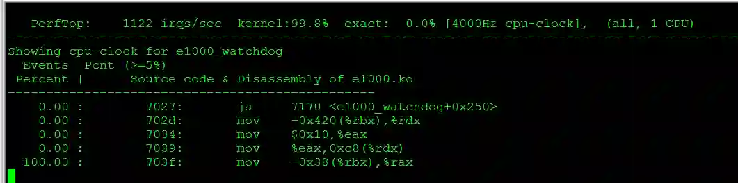 当然,如果想要继续分析下去,还可以按s,再输入函数名,如图所示,我输入了函数e1000_watchdog,显示下面具体的code地址及原子操作。这里的ja和mov都是汇编语言的一些操作,ja是判断两个无符号数之间的大小关系然后跳转,mov是数据传送指令。