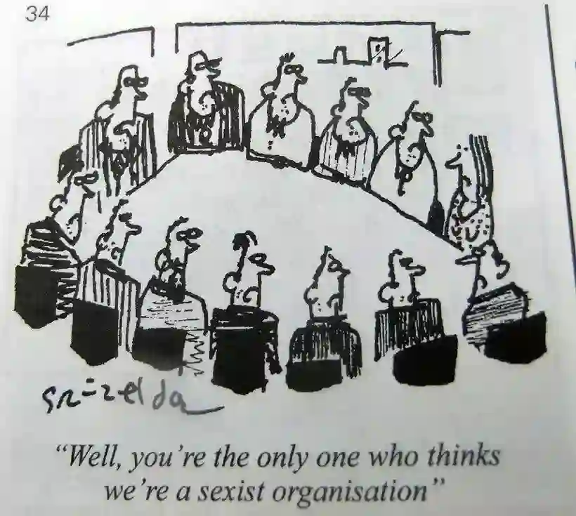 继续说我们的这个实验,让我们来看看一个简单的工作场所中的例子:在会议室,出现了一些性别歧视的言论。