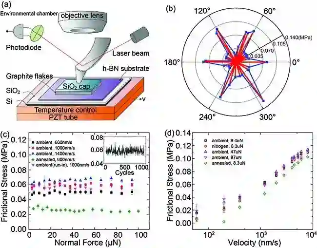 (a)实验装置图,微米尺度石墨岛在原子力显微镜针尖驱动下相对于六方氮化硼表面滑动;(b)实验测得的微米尺度单晶石墨和六方氮化硼表面间的各向异性摩擦力;(c)不同相对运动速度与环境下,法向载荷对摩擦力的影响。内图表示1000个运动周期内摩擦力的变化;(d)不同法向载荷和环境下,相对运动速度对摩擦力的影响。