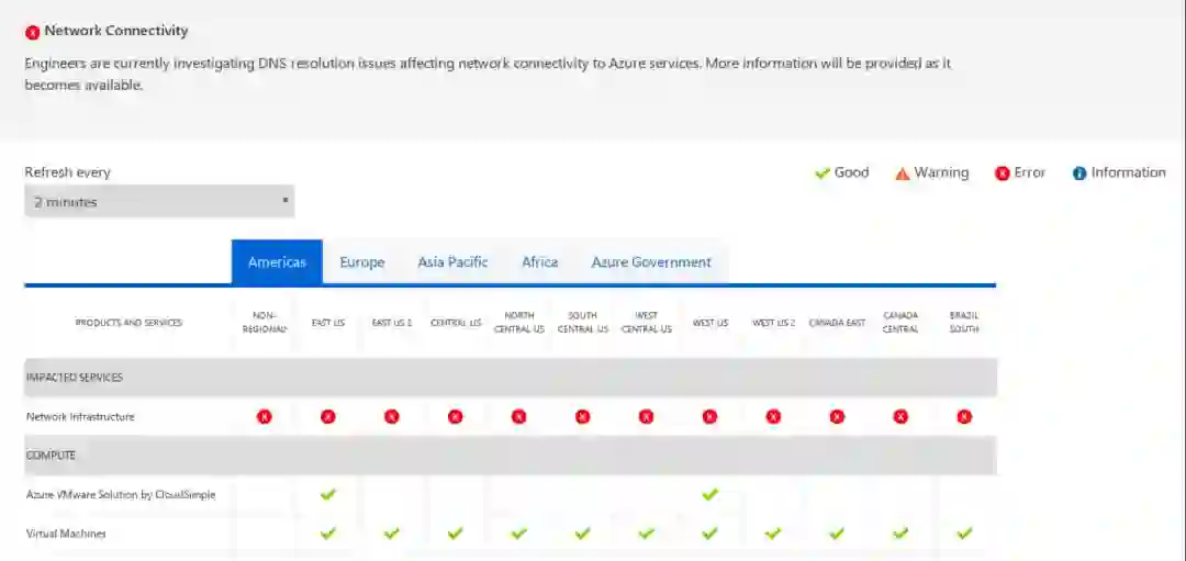 本文发稿时,这个云巨头在逐渐恢复如初,Azure地区在逐个地恢复正常,不过你遇到的实际情况可能会有所不同。问题似乎是从协调世界时(UTC)19点45分左右开始的。