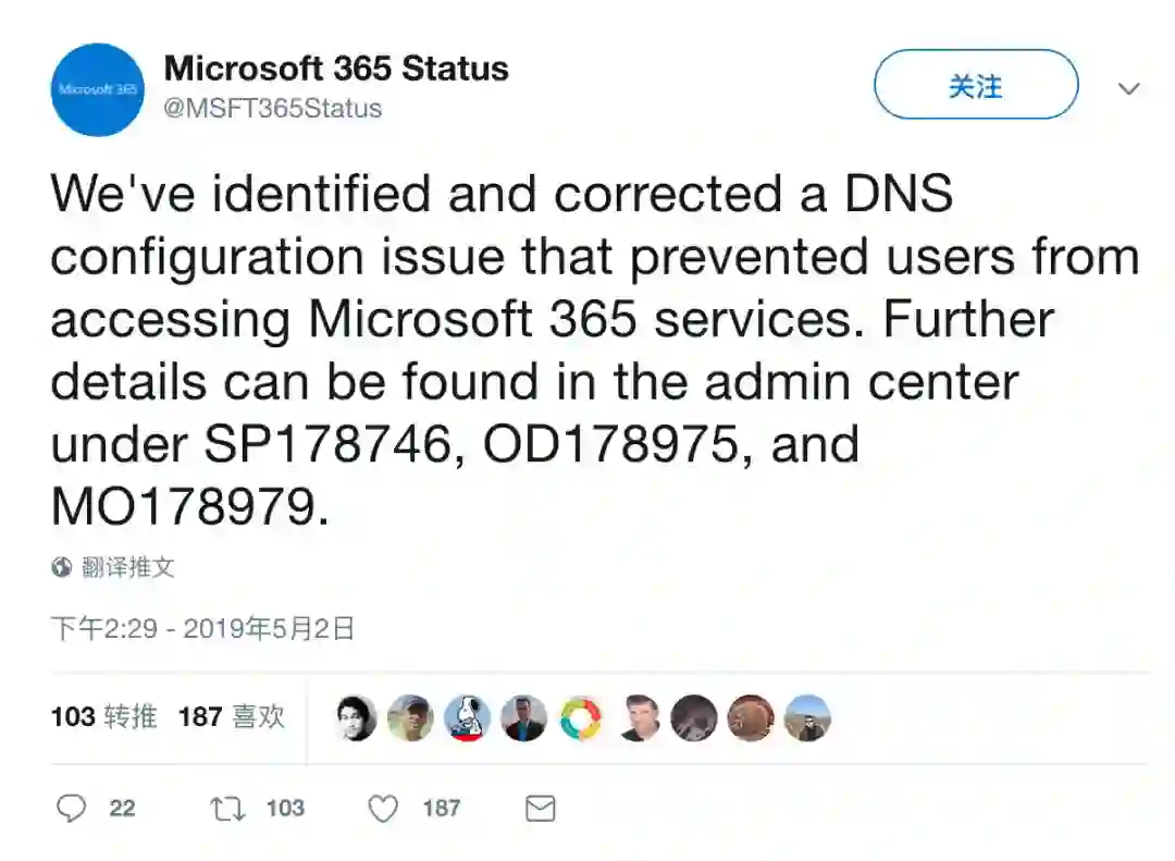 在Microsoft 365状态页面上,微软的技术人员声称内部DNS配置错误导致了这次宕机: