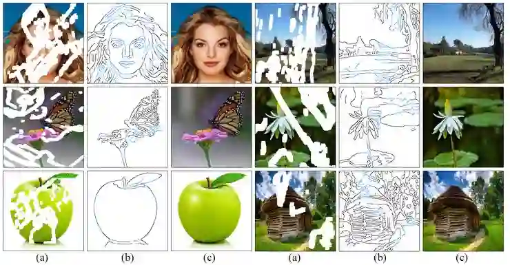 (a)输入有缺失区域的图像,缺失区域用白色表示。(b)计算得到的边缘,使用 Canny 边缘检测器计算(针对可用区域)黑色绘制的边缘;而蓝色显示的边缘由边缘生成器网络描绘。(c)拟用方法的图像修复结果。