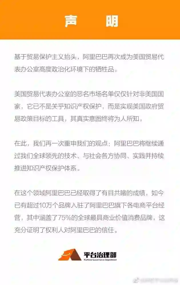 阿里巴巴在声明中表示:“不幸的是,美国贸易代表办公室的决定让我们怀疑,该机构的行为是基于事实,还是受到了当前政治气氛的影响。”
