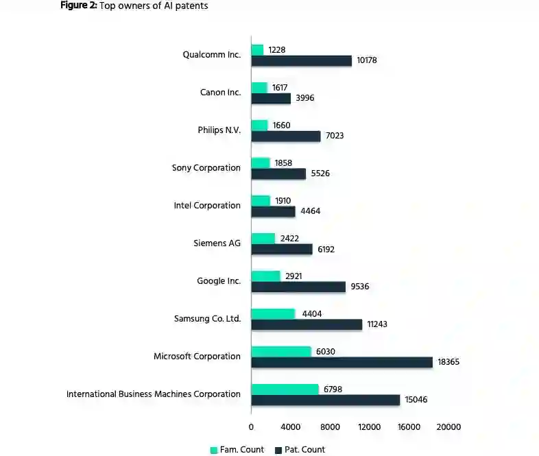 该研究报告样本覆盖全面,分析了全球 204947 个专利系列中的 448,684 项专利。透过这份报告,我们可以清晰地看到全球人工智能专利数量的排名情况。IBM 拥有人工智能专利 15046 项,仅次于微软,三星排名第三,拥有 11243 项。