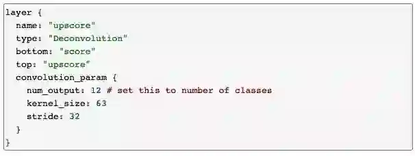表2表明,通过所有conv1到upscore的层时,神经网络的输出被18个像素根据输入做了相应移动。最后一个分割模型中的技巧,是一个修剪网络输出、移除每个边界上额外的18像素的层。这很容易在Caffe 的 Crop layer 中实现,下面的清单中对这些做了定义。