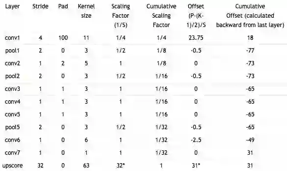 表2:卷积化的Alexnet中,遍布连续层的缩放因子和抵消补偿。* 对反卷积层来说缩放因子等于步幅,抵消等于(k - 1)/ 2 p。