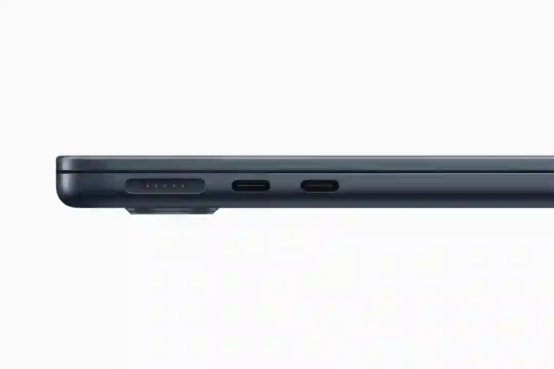 MagSafe 重回 MacBook Air,为用户带来专用充电端口,方便连接,同时还能在连接状态下的充电线遭意外拉扯时迅速脱离,从而保护 MacBook Air。MacBook Air 还配备 2 个用于连接若干配件的雷雳端口,以及一个支持连接高阻抗耳机的 3.5 毫米音频插孔。此外,妙控键盘配有全高功能键行,带有触控 ID 和宽大的、业界领先的力度触控板。