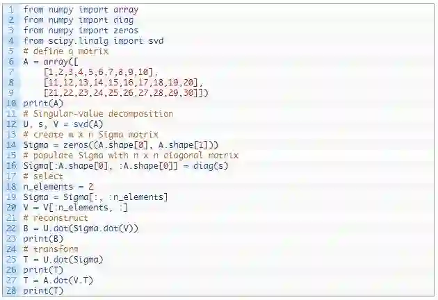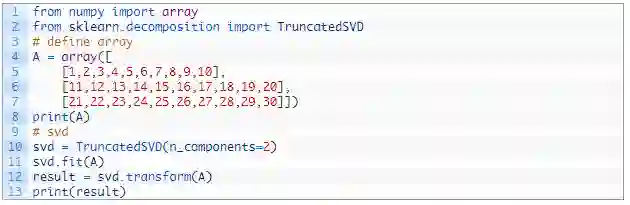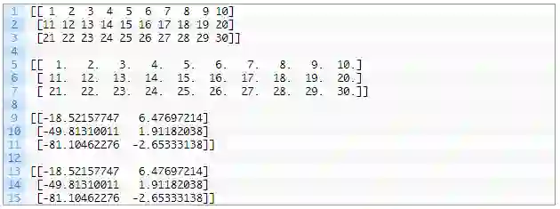 首先定义一个 3×10 的矩阵,其列数多于行数。然后计算 SVD 并且只选取其前两个特征。这些元素再重新结合起来,得到原始矩阵的准确再现。最后计算转换的方式有两种。