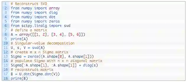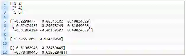 该函数在处理矩阵后会返回 U、Sigma 和 V^T 元素。Sigma 对角矩阵是按奇异值向量的形式返回的。V 矩阵是以转置后的形式返回的,比如 V.T.
