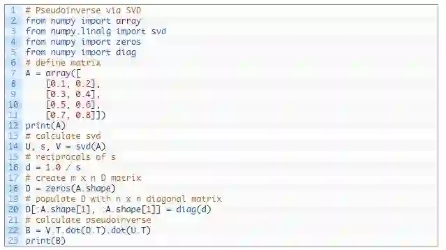 首先我们必须计算 SVD。然后我们必须计算 s 数组中每个值的倒数。然后将这个 s 数组转换成一个对角矩阵,它额外增加了一行 0 以使其变成矩形形式。最后,我们可以根据这些元素计算伪逆。