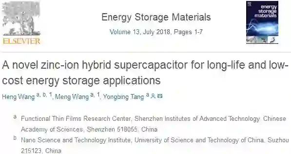 近日,中国科学院深圳先进技术研究院功能薄膜材料研究中心研究员唐永炳团队成功研发出一种新型锌离子混合超级电容器,该工作对研究基于多价载流子的新型储能器件具有重要借鉴意义。相关研究成果以A Novel Zinc-Ion Hybrid Supercapacitor for Long-Life and Low-Cost Energy Storage Applications为题,发表在储能材料领域期刊Energy Storage Materials上。