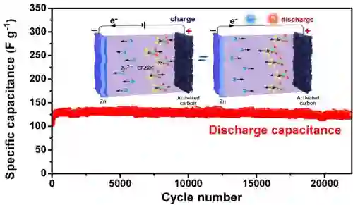 锌的储量丰富,离子为+2价,可使基于锌离子的混合超级电容器获得高能量密度的同时,保持低成本、易回收等优势。经过系统优化后,这种锌离子混合超级电容器获得了优异的电化学性能:1725W/kg的功率密度下,能量密度高于52Wh/kg;并且22000次循环后,容量保持率高于91%。在可再生清洁能源领域的规模化储能具有良好的应用前景。该项研究得到了国家自然科学基金、广东省科技计划项目、深圳市科技计划项目等的资助。