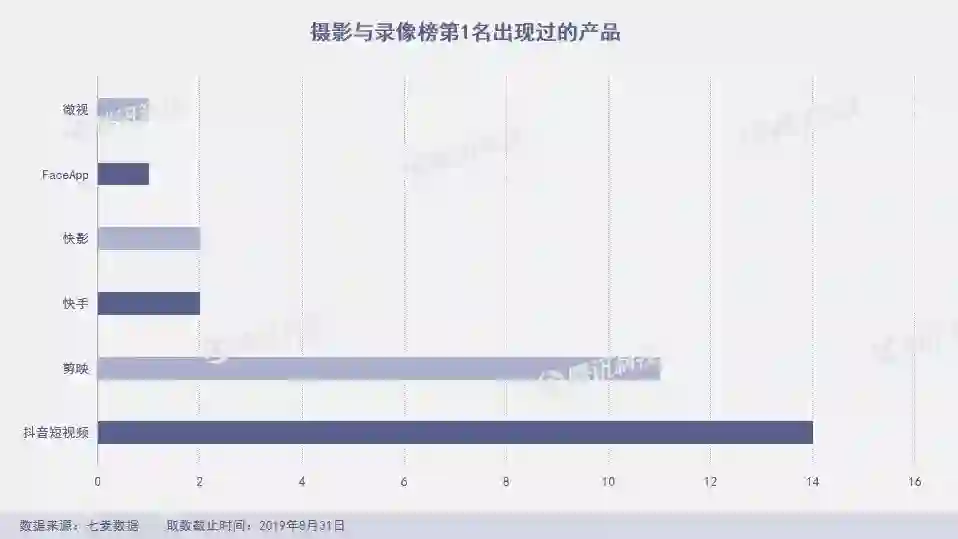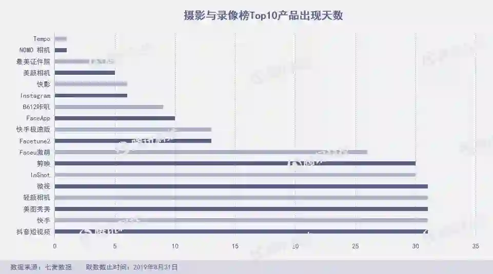 18款产品承包8月份摄影与录像榜单,其中快手极速版在摄影榜Top 10出现13天。