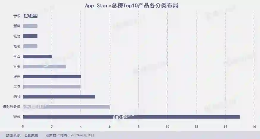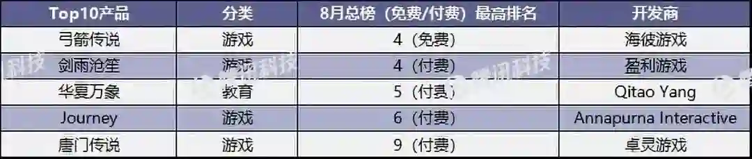 8月份,总榜Top 10共出现过43款产品,其中游戏和摄影类分别占据15款和6款。
