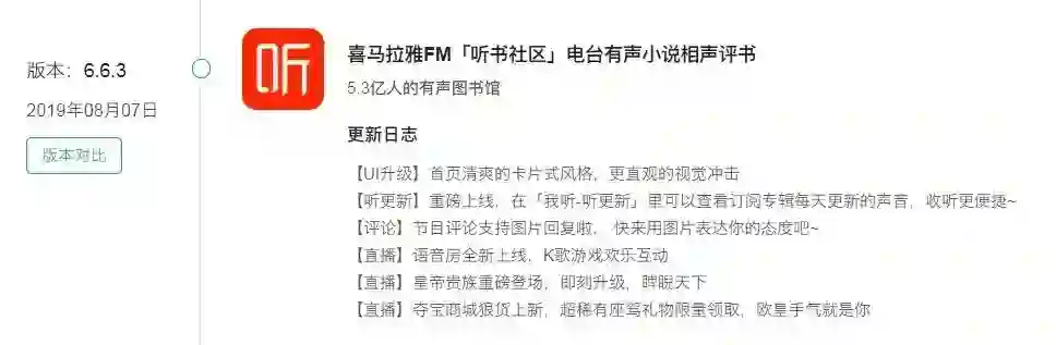 7月底重新上架的喜马拉雅,版本更新至6.6.3版,并上线语音房、K歌游戏互动等新功能: