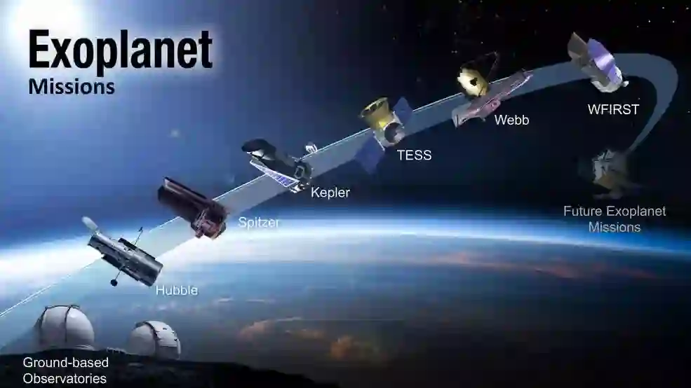 NASA 地外行星探索计划的各组成部分,包括 W. M. Keck 天文台等地面观测点;哈勃、史匹哲、开普勒等太空观测点;凌日系外行星观测卫星;詹姆斯·韦伯太空望远镜;广角红外线探测望远镜,以及未来可能的其它太空观测项目。