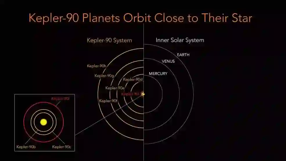 开普勒 90 是一颗类似太阳的恒星,与我们的太阳系相同的是,它也拥有 8 颗行星,而不同点在于,它的 8 颗行星间的距离远小于太阳系,如上图所示,最外围的第 8 颗行星开普勒 90h 距离恒星开普勒 90 的距离还小于我们的地球到太阳的距离(日地距离约 1.5 亿公里)。也正是因为距离近,所以行星公转一周所需的时间也很短,以此次发现的开普勒 90i 为例,它公转一周只需要 14.4 天,相比之下,即便是太阳系中公转速度最快的水星公转一周也需要 88 天。但距离近也就意味着非常高的温度,开普勒 90i 的表面温度为华氏 800 度(摄氏 426 度),这么高的温度肯定不会允许任何生命存在。而经过对开普勒 90 星系结构的分析,天文学家发现该星系中的 8 颗行星的分布规律与太阳系类似,它们原本的分布距离更加分散,只是后来才逐渐“聚集”到开普勒 90 周围的。
