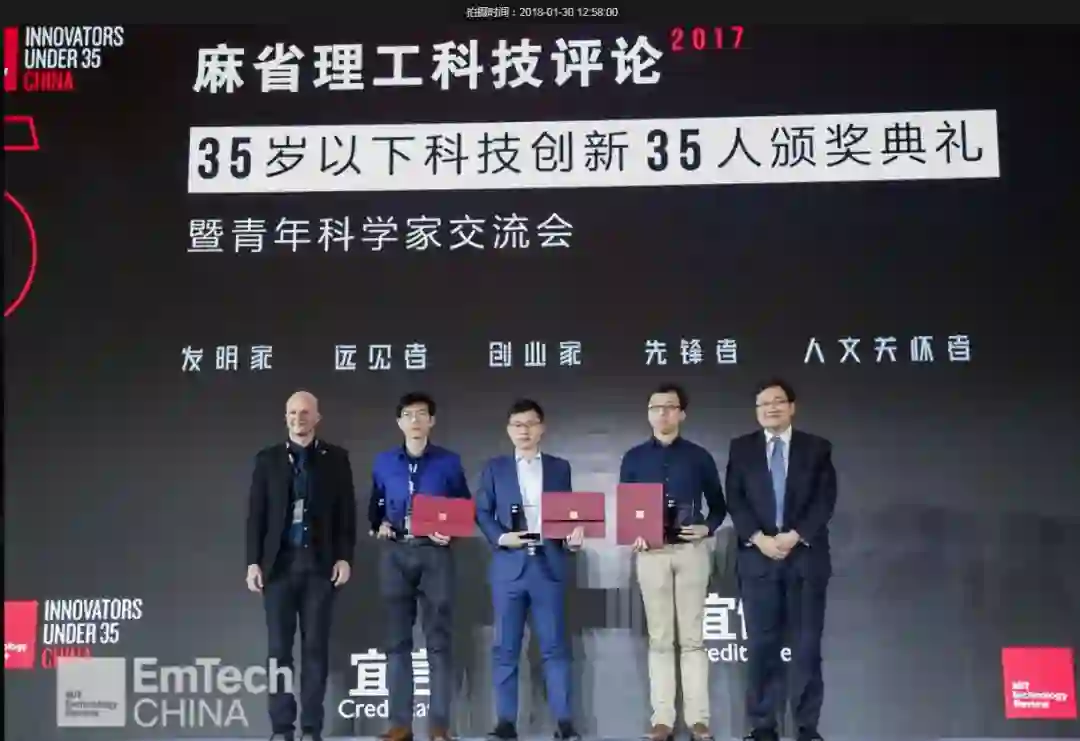 图丨在《麻省理工科技评论》 2017 年中国区“35 岁以下科技创新 35 人”颁奖仪式上,宜信创始人、CEO唐宁和Founders Fund的首席科学家Aaron Vandevender共同为三名到场获奖者颁出了“创业家”奖